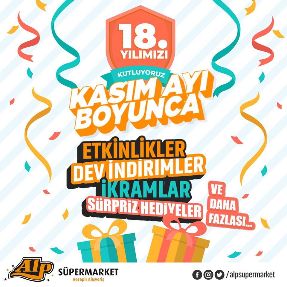 Hiçbir yerde bulamayacağınız indirim fırsatları, dev kampanyalar ve sürpriz hediyeler, 18. yıla özel Kasım ayı boyunca Alp Süpermarket mağazalarında sizleri bekliyor olacak!
